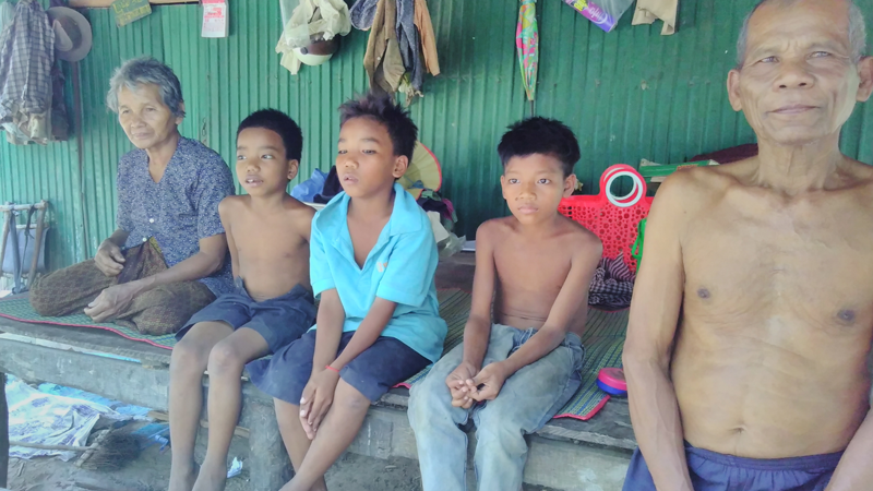 Sokreï et Bissec ont 65 et 67 ans. Après avoir perdu leur fils unique, ces grands-parents ont vu la mère de leurs petits-enfants quitter le domicile pour tenter un nouveau mariage et une nouvelle vie. Le couple fatigué doit à présent nourrir 5 enfants, âgés de 8 à 14 ans. Pour cela, ils partent à tour de rôle à l’aube couper un peu de bois et tenter de le vendre aux alentours. Quelques riels par ci, un dollars par là… Et la vie des enfants suit son cours avec les moyens du bord. Les deux plus jeunes sont élèves en grade 2 et 3. Les plus grands n’ont pas eu la chance de pouvoir aller à l’école, ils espèrent donc pouvoir bénéficier d’une formation professionnelle. Les plus chanceux seront guides ou chauffeurs et le reste travaillera sur les chantiers ou dans les champs.