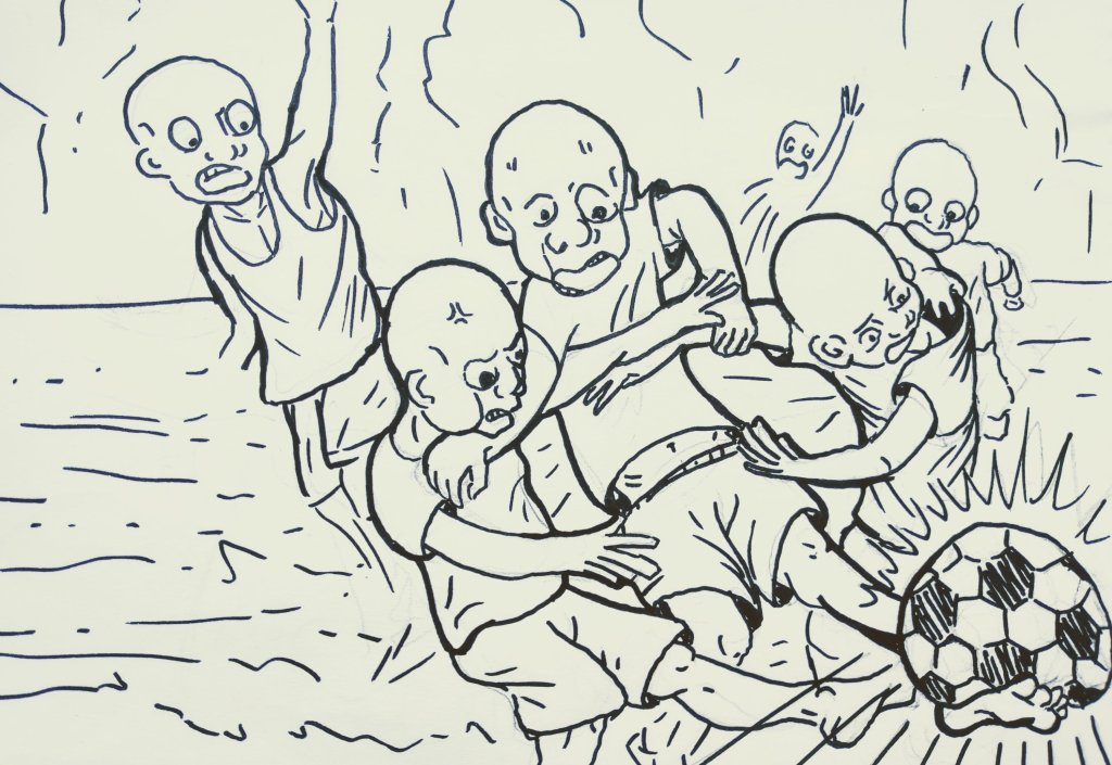Un pyjama trop grand en guise de maillot du jour. Un doigt dans chaque narine, les pieds nus dans la poussière. Pas plus hauts que trois pommes mais déjà des attitudes fières et des langages fleuris, tous les enfants du quartier sont là, assis sur le sable, la tête nue sous un soleil de plomb. Déjà une heure qu’ils attendent. Ils peuvent attendre une heure de plus, même deux… jusqu’à la tombée de la nuit s’il le faut. De toute façon, à la maison, il n’y a pas grand-chose de mieux à faire. Pas de devoirs, pas de jeux vidéo, pas de livres ou de bandes dessinées… Alors, comme tous les jours après l’école – qui se termine de bonne heure – on attend sur le terrain vague. On attend le ballon.